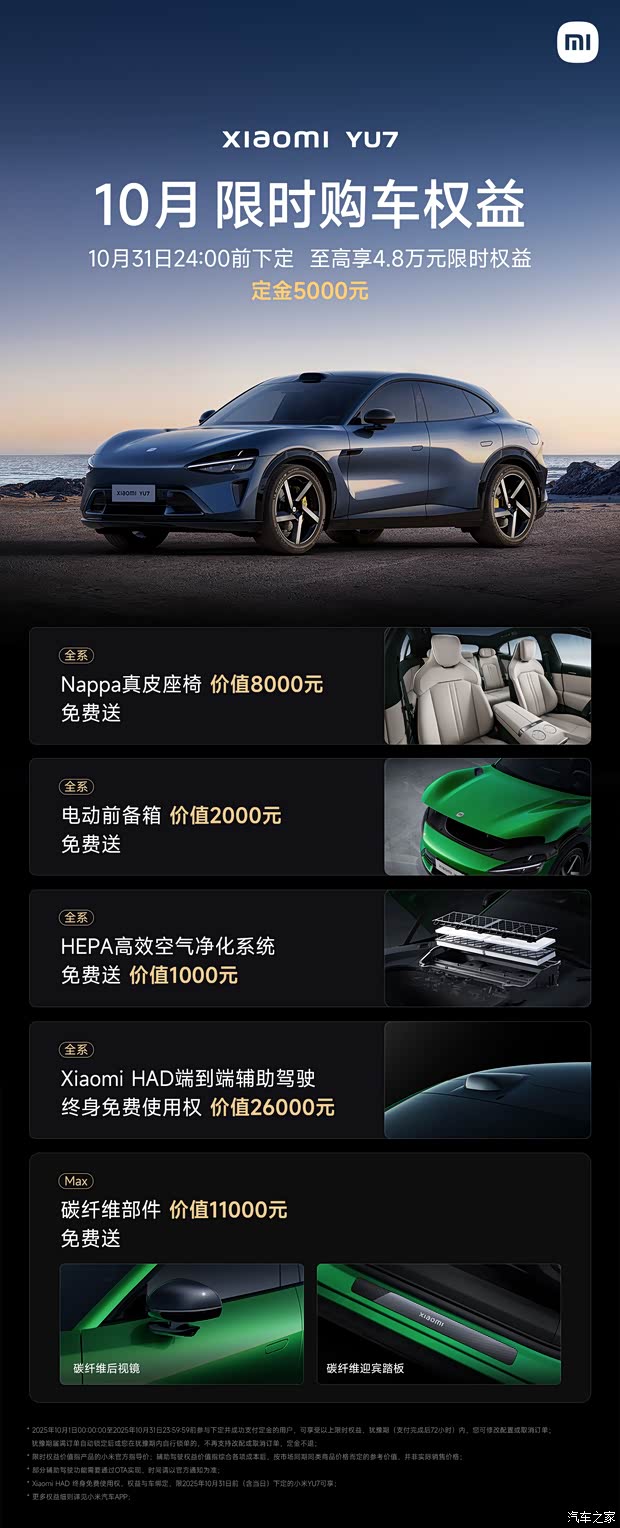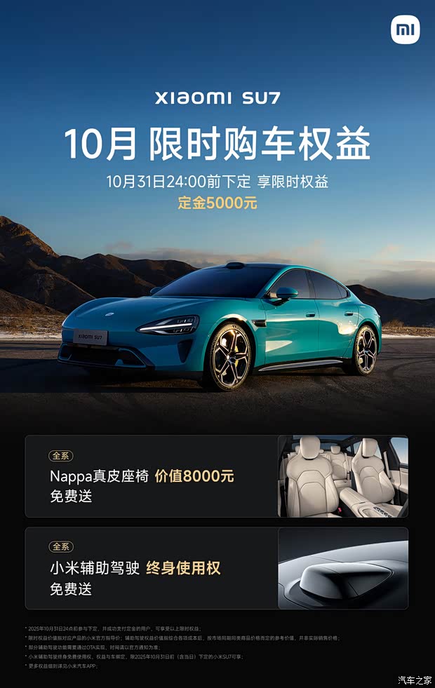 10月政策方面,官方还发布了10月购车政策,全国119城已有402家门店。在2025年10月31日24:00前下定小米SU7(参数|询价)并成功支付5000元定金的用户,鄂尔多斯、 10月1日,小米HAD全方位辅助驾驶终身免费使用权(价值2.6万元)等权益。五年基础保障(4000元)、